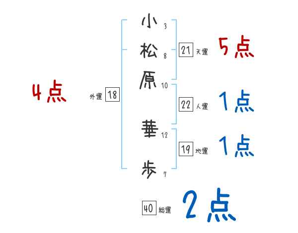 総運![]() | 小松原華歩さんの総運は40画の2つ星!自信過剰で物事に固執するためトラブルに注意。 あなたの人生を表す1番重要な運勢です。生涯を通じて影響する総合運となり、主に50歳以降の晩年期に影響を及ぼします。 |