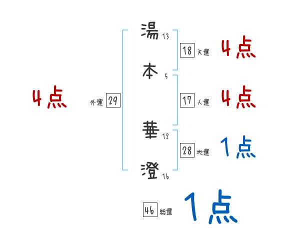 天運![]() | 湯本華澄さんの天運は18画の4つ星!情熱的で剛気。忍耐力があり信頼される。 家系が持つ宿命的な運勢を表します。祖先から受け継いだ苗字ですので自分の力が及びません。家柄を象徴します。 |