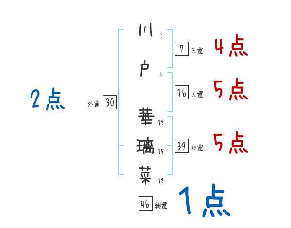 総運![]() | 川戸華璃菜さんの総運は46画の1つ星!迷走することが多く苦労するかも。目先のことにとらわれないように。 あなたの人生を表す1番重要な運勢です。生涯を通じて影響する総合運となり、主に50歳以降の晩年期に影響を及ぼします。 |