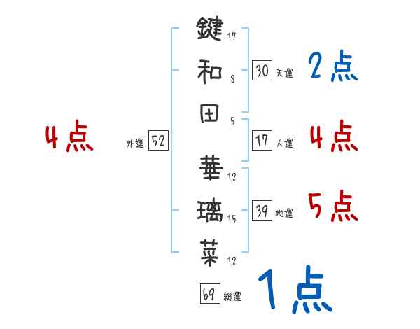 外運![]() | 鍵和田華璃菜さんの外運は52画の4つ星!先見性と独創性に優れ考える力がある。強運の持ち主。 生活面を象徴する運勢です。外部から受ける影響力を表し、結婚運、家庭運や職場、環境への順応性を表します。 |