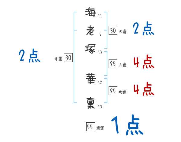 天運![]() | 海老塚華稟さんの天運は30画の2つ星!浮き沈みの激しさに注意しましょう。 家系が持つ宿命的な運勢を表します。祖先から受け継いだ苗字ですので自分の力が及びません。家柄を象徴します。 |