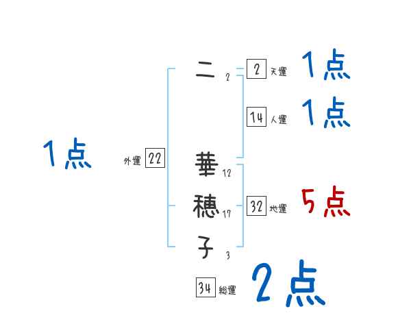 総運![]() | 二華穂子さんの総運は34画の2つ星!独創性に優れるが、自尊心が強く災難に注意しましょう。 あなたの人生を表す1番重要な運勢です。生涯を通じて影響する総合運となり、主に50歳以降の晩年期に影響を及ぼします。 |