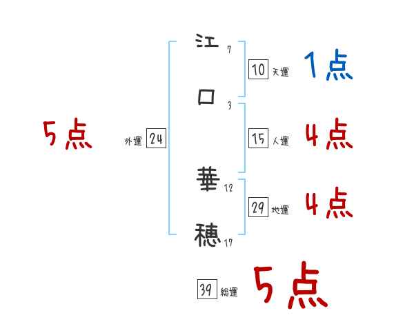 外運![]() | 江口華穂さんの外運は24画の5つ星!家庭運が良く順調な人生。金運にも恵まれる。 生活面を象徴する運勢です。外部から受ける影響力を表し、結婚運、家庭運や職場、環境への順応性を表します。 |
