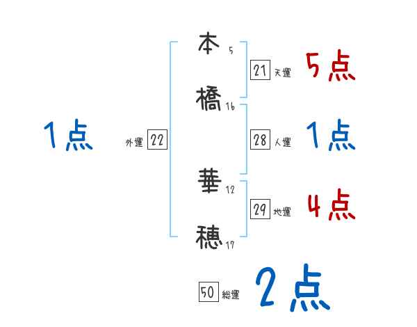 天運![]() | 本橋華穂さんの天運は21画の5つ星!統率力がある。独立し成功する。名誉を手に入れる。 家系が持つ宿命的な運勢を表します。祖先から受け継いだ苗字ですので自分の力が及びません。家柄を象徴します。 |