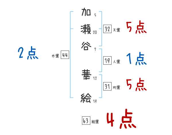 天運![]() | 加瀬谷華絵さんの天運は32画の5つ星!柔軟性があり成功する。チャンスが多く金運が良い。 家系が持つ宿命的な運勢を表します。祖先から受け継いだ苗字ですので自分の力が及びません。家柄を象徴します。 |