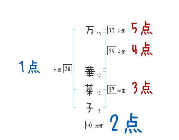 天運![]() | 万華菜子さんの天運は13画の5つ星!才能に恵まれ人気がある。名声を手に入れる。円満な人生。 家系が持つ宿命的な運勢を表します。祖先から受け継いだ苗字ですので自分の力が及びません。家柄を象徴します。 |