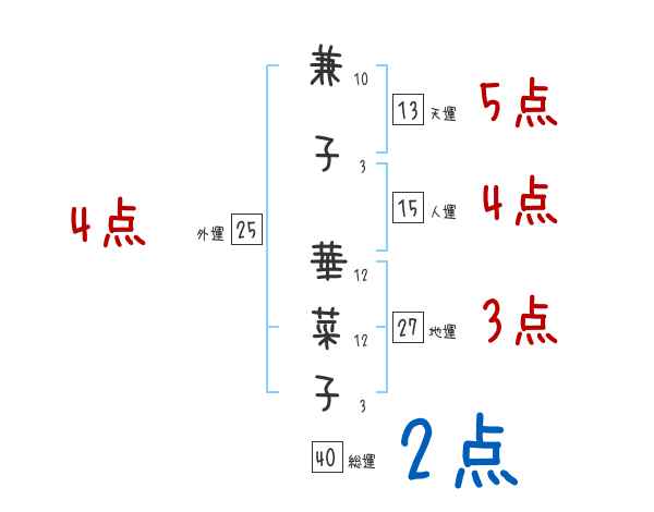 天運![]() | 兼子華菜子さんの天運は13画の5つ星!才能に恵まれ人気がある。名声を手に入れる。円満な人生。 家系が持つ宿命的な運勢を表します。祖先から受け継いだ苗字ですので自分の力が及びません。家柄を象徴します。 |