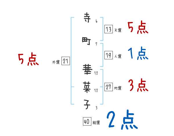 天運![]() | 寺町華菜子さんの天運は13画の5つ星!才能に恵まれ人気がある。名声を手に入れる。円満な人生。 家系が持つ宿命的な運勢を表します。祖先から受け継いだ苗字ですので自分の力が及びません。家柄を象徴します。 |