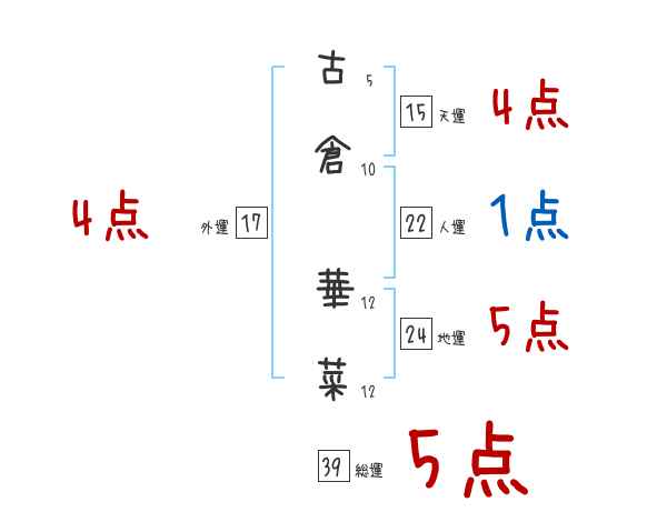 天運![]() | 古倉華菜さんの天運は15画の4つ星!人徳があり出世する。順調に物事を進め円満な人生。 家系が持つ宿命的な運勢を表します。祖先から受け継いだ苗字ですので自分の力が及びません。家柄を象徴します。 |