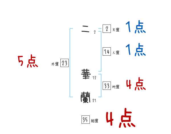 総運![]() | 二華蘭さんの総運は35画の4つ星!温厚な性格で感受性が高い。穏和な性格で人望が厚い。 あなたの人生を表す1番重要な運勢です。生涯を通じて影響する総合運となり、主に50歳以降の晩年期に影響を及ぼします。 |