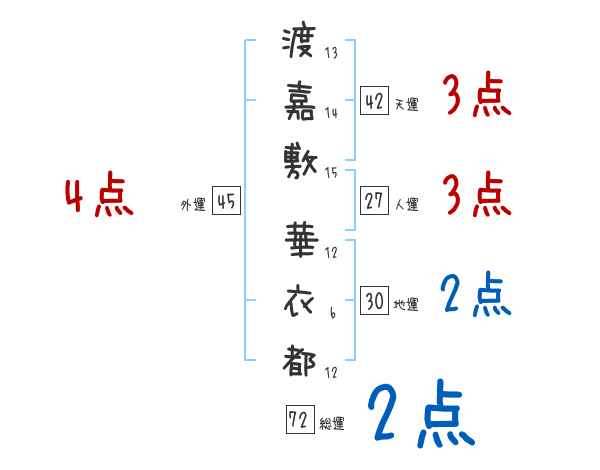総運![]() | 渡嘉敷華衣都さんの総運は72画の2つ星!災難が多く不安定な生活にならないように注意。明暗のある人生かも。 あなたの人生を表す1番重要な運勢です。生涯を通じて影響する総合運となり、主に50歳以降の晩年期に影響を及ぼします。 |