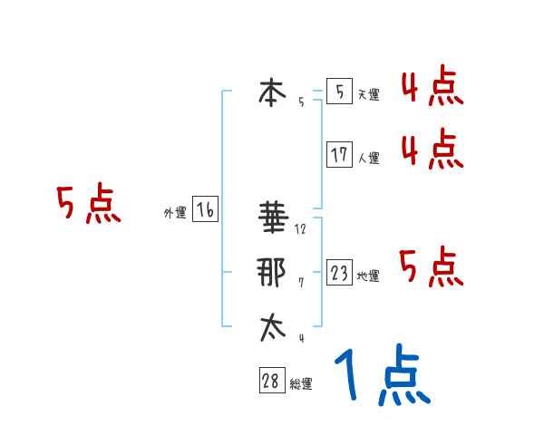 天運![]() | 本華那太さんの天運は5画の4つ星!健康で安泰。協調性に優れ、財産に恵まれる。 家系が持つ宿命的な運勢を表します。祖先から受け継いだ苗字ですので自分の力が及びません。家柄を象徴します。 |