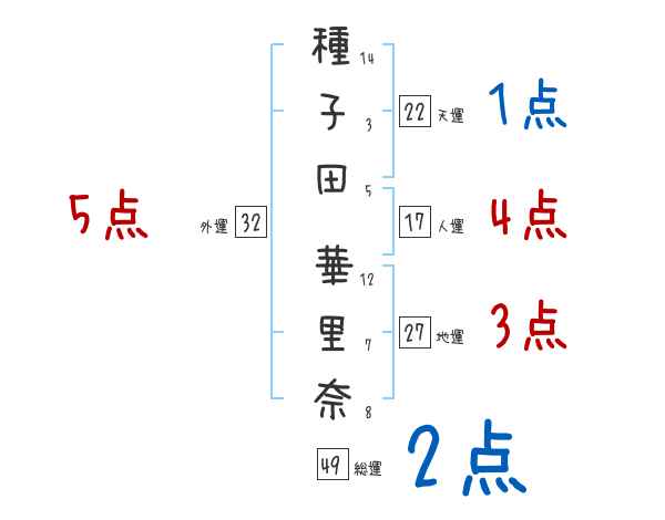 外運![]() | 種子田華里奈さんの外運は32画の5つ星!柔軟性があり成功する。チャンスが多く金運が良い。 生活面を象徴する運勢です。外部から受ける影響力を表し、結婚運、家庭運や職場、環境への順応性を表します。 |