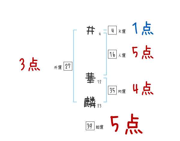 総運![]() | 井華麟さんの総運は39画の5つ星!社交性に優れ人望が厚い。人の上に立ち成功する。 あなたの人生を表す1番重要な運勢です。生涯を通じて影響する総合運となり、主に50歳以降の晩年期に影響を及ぼします。 |