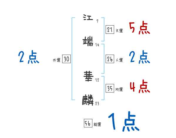 天運![]() | 江端華麟さんの天運は21画の5つ星!統率力がある。独立し成功する。名誉を手に入れる。 家系が持つ宿命的な運勢を表します。祖先から受け継いだ苗字ですので自分の力が及びません。家柄を象徴します。 |