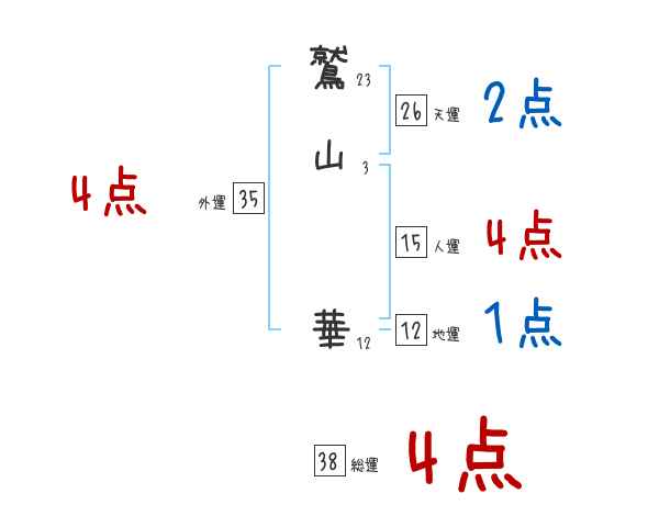 人運![]() | 鷲山華さんの人運は15画の4つ星!人徳があり出世する。順調に物事を進め円満な人生。 性格や才能などを表す2番目に重要な運勢です。人間関係や協調性、社会的な成功に影響します。主に20歳から50歳ぐらいまでの中年期の運勢を表します。 |