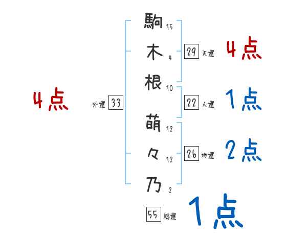 天運![]() | 駒木根萌々乃さんの天運は29画の4つ星!完全主義で才能がある。厳格な心の持ち主。 家系が持つ宿命的な運勢を表します。祖先から受け継いだ苗字ですので自分の力が及びません。家柄を象徴します。 |