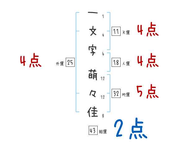 総運![]() | 一文字萌々佳さんの総運は43画の2つ星!頑固な性格で独立心が強いかも。やや非現実的で浪費に注意しましょう。 あなたの人生を表す1番重要な運勢です。生涯を通じて影響する総合運となり、主に50歳以降の晩年期に影響を及ぼします。 |