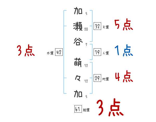 外運![]() | 加瀬谷萌々加さんの外運は42画の3つ星!病気に注意。多芸であるが消極的でおとなしい。 生活面を象徴する運勢です。外部から受ける影響力を表し、結婚運、家庭運や職場、環境への順応性を表します。 |