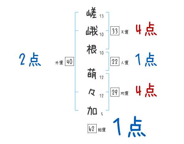 天運![]() | 嵯峨根萌々加さんの天運は33画の4つ星!権力志向でプライドが高い。勇気があり運を切り開き成功する。 家系が持つ宿命的な運勢を表します。祖先から受け継いだ苗字ですので自分の力が及びません。家柄を象徴します。 |