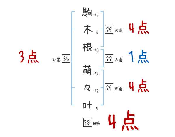 天運![]() | 駒木根萌々叶さんの天運は29画の4つ星!完全主義で才能がある。厳格な心の持ち主。 家系が持つ宿命的な運勢を表します。祖先から受け継いだ苗字ですので自分の力が及びません。家柄を象徴します。 |