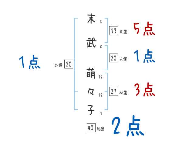 天運![]() | 末武萌々子さんの天運は13画の5つ星!才能に恵まれ人気がある。名声を手に入れる。円満な人生。 家系が持つ宿命的な運勢を表します。祖先から受け継いだ苗字ですので自分の力が及びません。家柄を象徴します。 |
