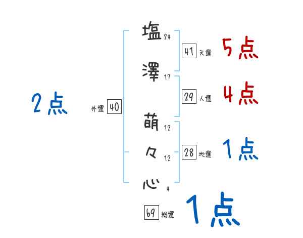 天運![]() | 塩澤萌々心さんの天運は41画の5つ星!大志を抱き、目標に向かって実力を発揮し達成する。温和な性格。 家系が持つ宿命的な運勢を表します。祖先から受け継いだ苗字ですので自分の力が及びません。家柄を象徴します。 |