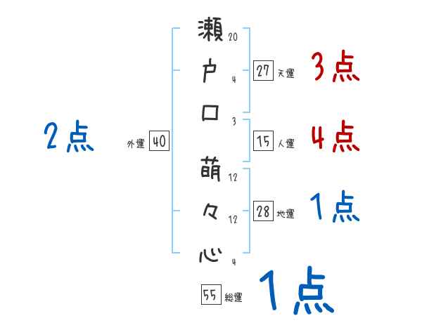 天運![]() | 瀬戸口萌々心さんの天運は27画の3つ星!頭脳明晰だが強情で摩擦が多い傾向。孤立に注意。 家系が持つ宿命的な運勢を表します。祖先から受け継いだ苗字ですので自分の力が及びません。家柄を象徴します。 |
