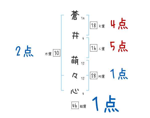 総運![]() | 蒼井萌々心さんの総運は46画の1つ星!迷走することが多く苦労するかも。目先のことにとらわれないように。 あなたの人生を表す1番重要な運勢です。生涯を通じて影響する総合運となり、主に50歳以降の晩年期に影響を及ぼします。 |