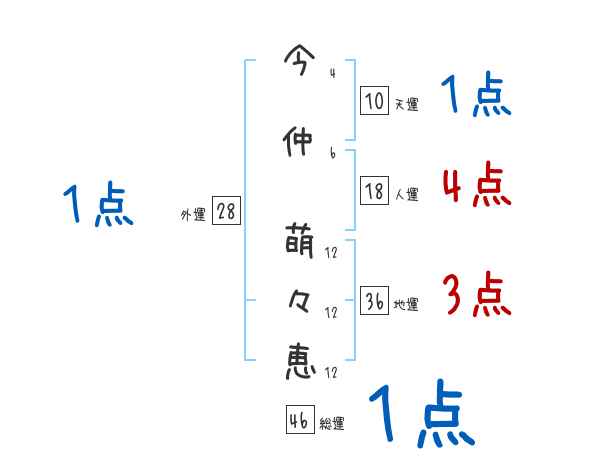 外運![]() | 今仲萌々恵さんの外運は28画の1つ星!家庭環境に注意。スポーツで活躍できる能力があるかも。 生活面を象徴する運勢です。外部から受ける影響力を表し、結婚運、家庭運や職場、環境への順応性を表します。 |