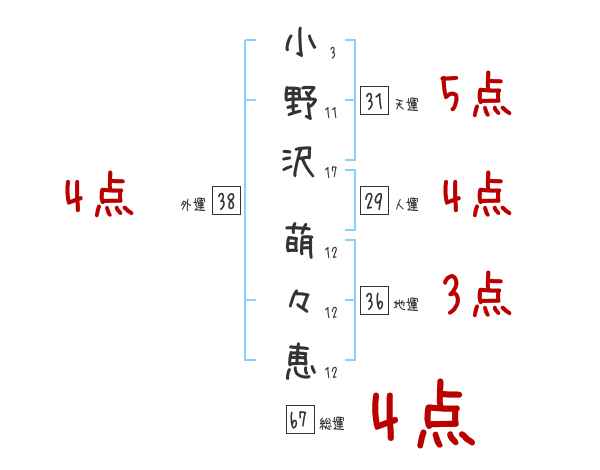外運![]() | 小野沢萌々恵さんの外運は38画の4つ星!温厚な性格で技術的な才能を発揮する。職人的な仕事に向いている。 生活面を象徴する運勢です。外部から受ける影響力を表し、結婚運、家庭運や職場、環境への順応性を表します。 |