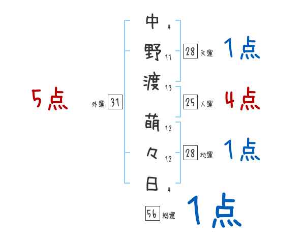 天運![]() | 中野渡萌々日さんの天運は28画の1つ星!家庭環境に注意。スポーツで活躍できる能力があるかも。 家系が持つ宿命的な運勢を表します。祖先から受け継いだ苗字ですので自分の力が及びません。家柄を象徴します。 |