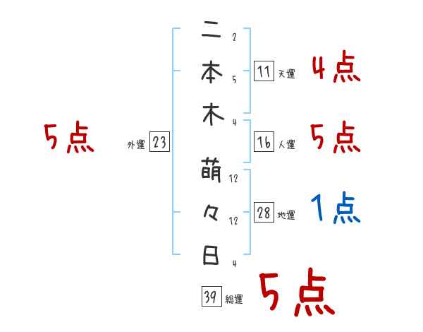 人運![]() | 二本木萌々日さんの人運は16画の5つ星!人望が厚く大きく発展する。逆転成功が見える。 性格や才能などを表す2番目に重要な運勢です。人間関係や協調性、社会的な成功に影響します。主に20歳から50歳ぐらいまでの中年期の運勢を表します。 |