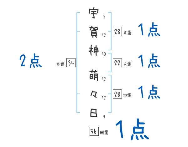 人運![]() | 宇賀神萌々日さんの人運は22画の1つ星!努力することが苦手ないっぽう手先が器用。芸術性にも優れる。 性格や才能などを表す2番目に重要な運勢です。人間関係や協調性、社会的な成功に影響します。主に20歳から50歳ぐらいまでの中年期の運勢を表します。 |