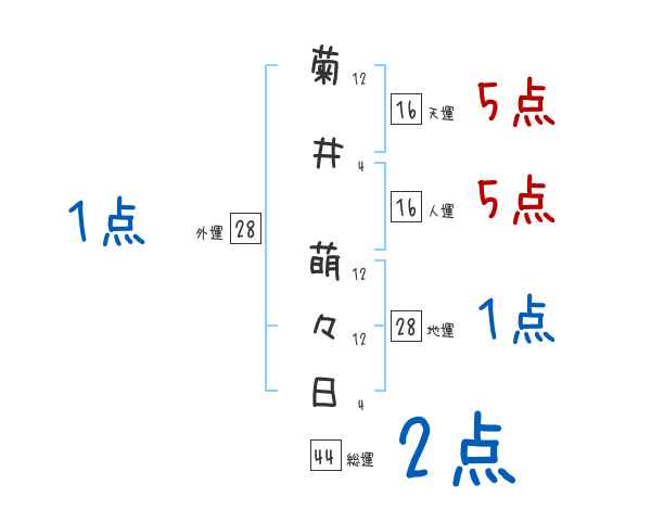 人運![]() | 菊井萌々日さんの人運は16画の5つ星!人望が厚く大きく発展する。逆転成功が見える。 性格や才能などを表す2番目に重要な運勢です。人間関係や協調性、社会的な成功に影響します。主に20歳から50歳ぐらいまでの中年期の運勢を表します。 |