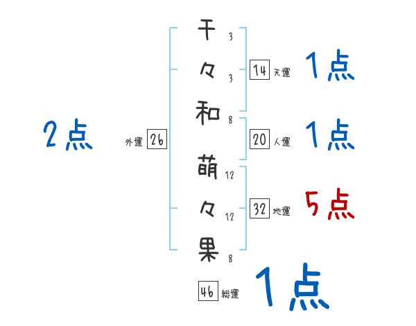 天運![]() | 千々和萌々果さんの天運は14画の1つ星!人に対して優しいがストレスを溜め込みがち。人間関係のトラブルを避けるよう気をつけましょう。 家系が持つ宿命的な運勢を表します。祖先から受け継いだ苗字ですので自分の力が及びません。家柄を象徴します。 |