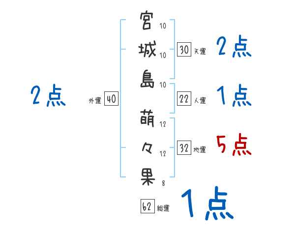 地運![]() | 宮城島萌々果さんの地運は32画の5つ星!柔軟性があり成功する。チャンスが多く金運が良い。 個性を表す基礎的な運勢です。性格形成や対人関係、行動力など家庭環境に影響されます。主に誕生してから20歳くらいまでの若年期の運勢を表します。 |