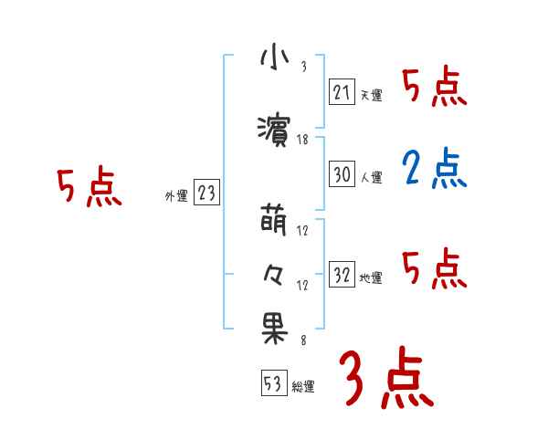 天運![]() | 小濵萌々果さんの天運は21画の5つ星!統率力がある。独立し成功する。名誉を手に入れる。 家系が持つ宿命的な運勢を表します。祖先から受け継いだ苗字ですので自分の力が及びません。家柄を象徴します。 |