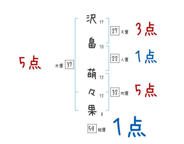 外運![]() | 沢畠萌々果さんの外運は37画の5つ星!努力家で順応性に優れる。現実的な考え方ができ忠実に物事をこなす。 生活面を象徴する運勢です。外部から受ける影響力を表し、結婚運、家庭運や職場、環境への順応性を表します。 |