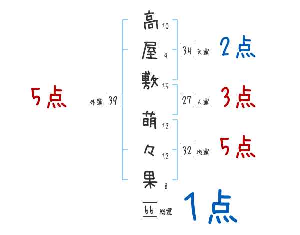 外運![]() | 高屋敷萌々果さんの外運は39画の5つ星!社交性に優れ人望が厚い。人の上に立ち成功する。 生活面を象徴する運勢です。外部から受ける影響力を表し、結婚運、家庭運や職場、環境への順応性を表します。 |