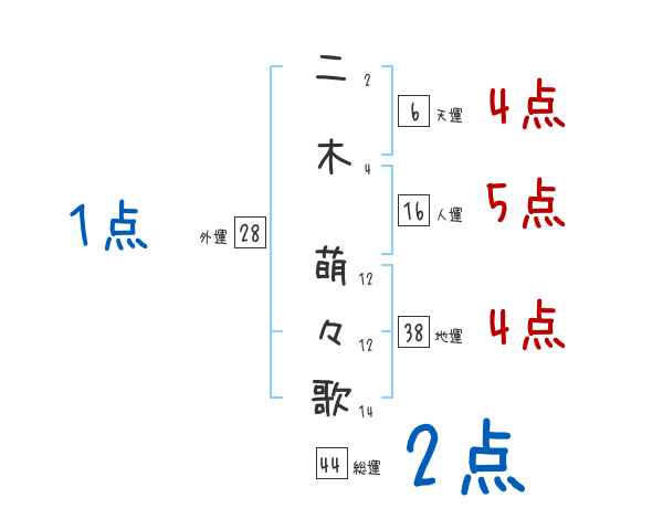 人運![]() | 二木萌々歌さんの人運は16画の5つ星!人望が厚く大きく発展する。逆転成功が見える。 性格や才能などを表す2番目に重要な運勢です。人間関係や協調性、社会的な成功に影響します。主に20歳から50歳ぐらいまでの中年期の運勢を表します。 |