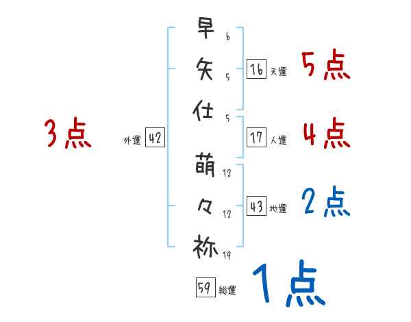 外運![]() | 早矢仕萌々祢さんの外運は42画の3つ星!病気に注意。多芸であるが消極的でおとなしい。 生活面を象徴する運勢です。外部から受ける影響力を表し、結婚運、家庭運や職場、環境への順応性を表します。 |