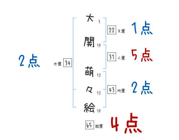 天運![]() | 大関萌々絵さんの天運は22画の1つ星!努力することが苦手ないっぽう手先が器用。芸術性にも優れる。 家系が持つ宿命的な運勢を表します。祖先から受け継いだ苗字ですので自分の力が及びません。家柄を象徴します。 |