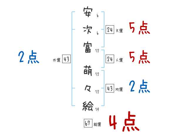 天運![]() | 安次富萌々絵さんの天運は24画の5つ星!家庭運が良く順調な人生。金運にも恵まれる。 家系が持つ宿命的な運勢を表します。祖先から受け継いだ苗字ですので自分の力が及びません。家柄を象徴します。 |