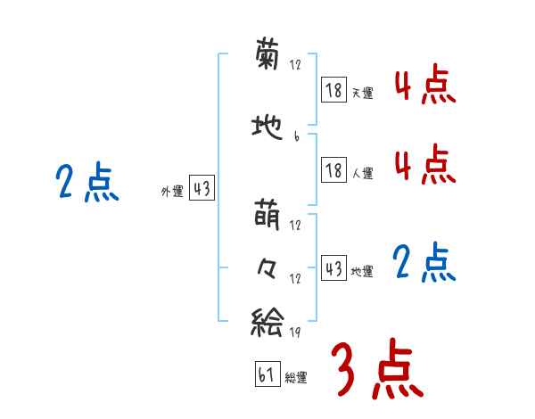 外運![]() | 菊地萌々絵さんの外運は43画の2つ星!頑固な性格で独立心が強いかも。やや非現実的で浪費に注意しましょう。 生活面を象徴する運勢です。外部から受ける影響力を表し、結婚運、家庭運や職場、環境への順応性を表します。 |