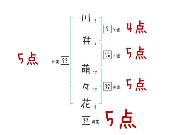 総運![]() | 川井萌々花さんの総運は39画の5つ星!社交性に優れ人望が厚い。人の上に立ち成功する。 あなたの人生を表す1番重要な運勢です。生涯を通じて影響する総合運となり、主に50歳以降の晩年期に影響を及ぼします。 |