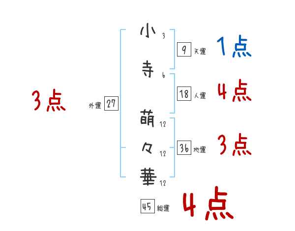 総運![]() | 小寺萌々華さんの総運は45画の4つ星!もくもくと物事を進め達成する。地味な努力家。 あなたの人生を表す1番重要な運勢です。生涯を通じて影響する総合運となり、主に50歳以降の晩年期に影響を及ぼします。 |