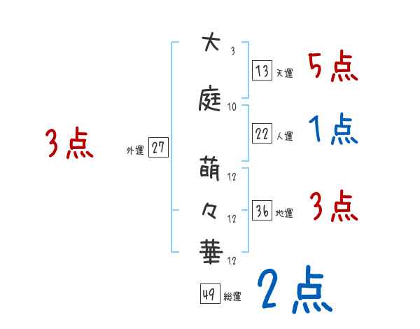 外運![]() | 大庭萌々華さんの外運は27画の3つ星!頭脳明晰だが強情で摩擦が多い傾向。孤立に注意。 生活面を象徴する運勢です。外部から受ける影響力を表し、結婚運、家庭運や職場、環境への順応性を表します。 |