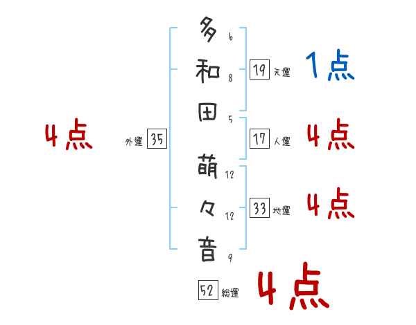 外運![]() | 多和田萌々音さんの外運は35画の4つ星!温厚な性格で感受性が高い。穏和な性格で人望が厚い。 生活面を象徴する運勢です。外部から受ける影響力を表し、結婚運、家庭運や職場、環境への順応性を表します。 |
