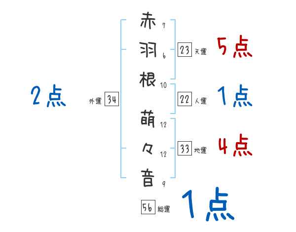 天運![]() | 赤羽根萌々音さんの天運は23画の5つ星!想像力に優れ活力がある。一代で成功し名誉を手に入れる。 家系が持つ宿命的な運勢を表します。祖先から受け継いだ苗字ですので自分の力が及びません。家柄を象徴します。 |